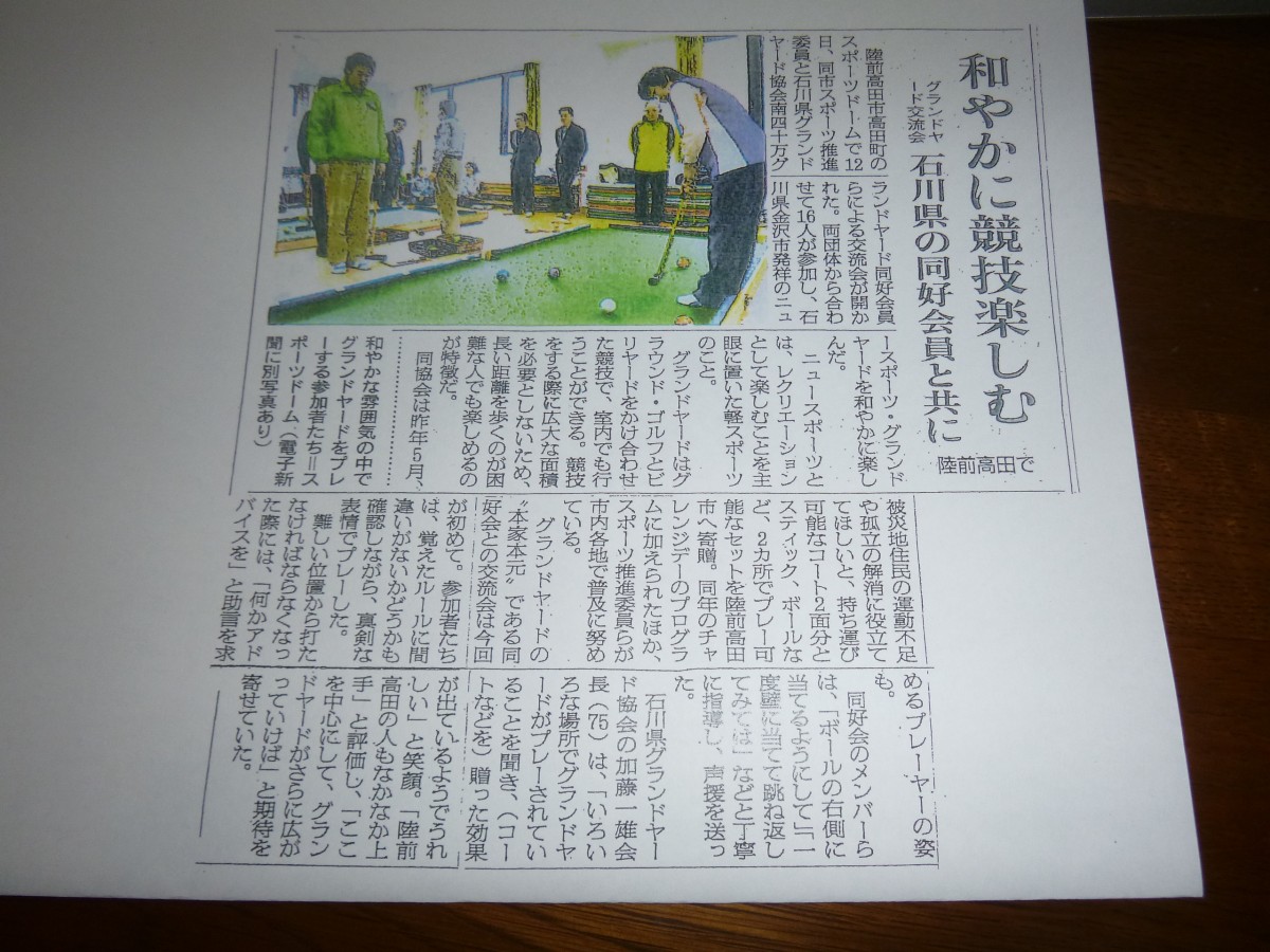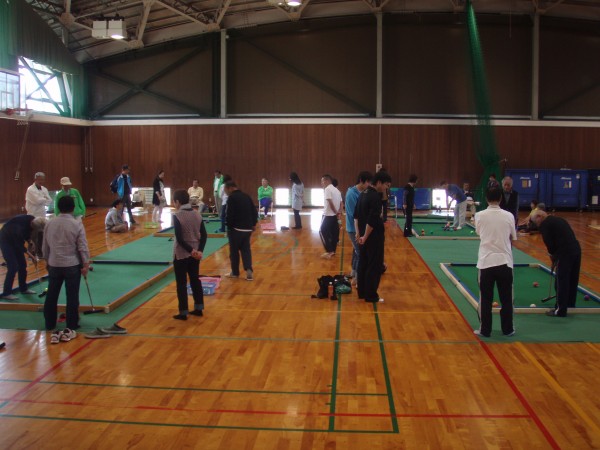 震災被害の住民の運動不足解消と地域コミュニティーを目的としています。陸前高田市代表のスポーツ推進委員に南四十万グランドヤード同好会会員8名が大会の運営方法等を中心に講習を行い、後に親善の試合形式も行ってきました。益々その楽しさがわかっていただけたようです。