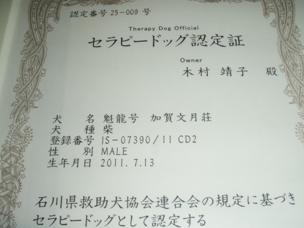 石川県救助犬協会連合会のセラピー試験に合格しました。